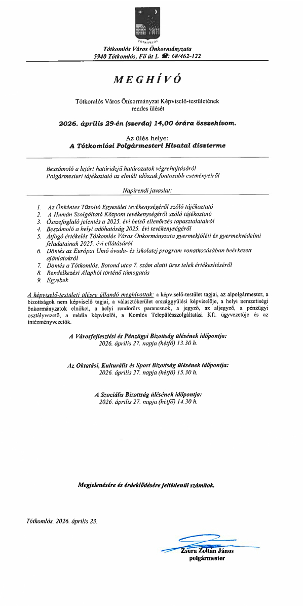 Meghívó Tótkomlós Város Önkormányzat Képviselő-testületének ülésére