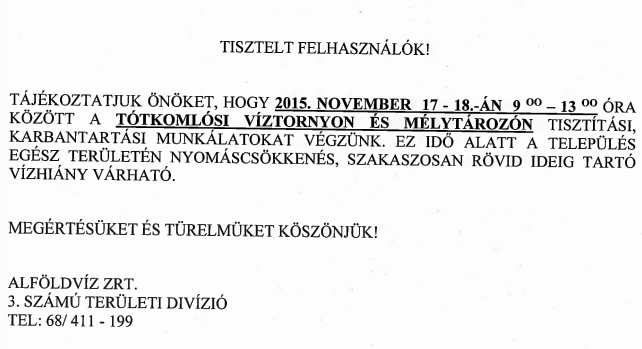 2015. november 17-18-án a tótkomlósi víztornyon és mélytározón tisztítási, karbantartási munkálatokat végzünk
