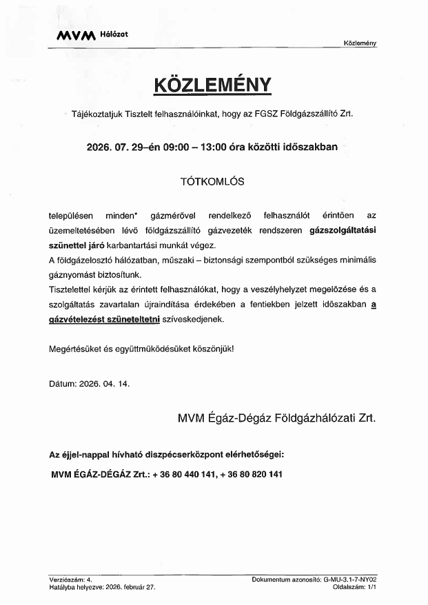 Az FGSZ Földgázszállító Zrt. gázszolgáltatási szünettel járó karbantartási munkát végez