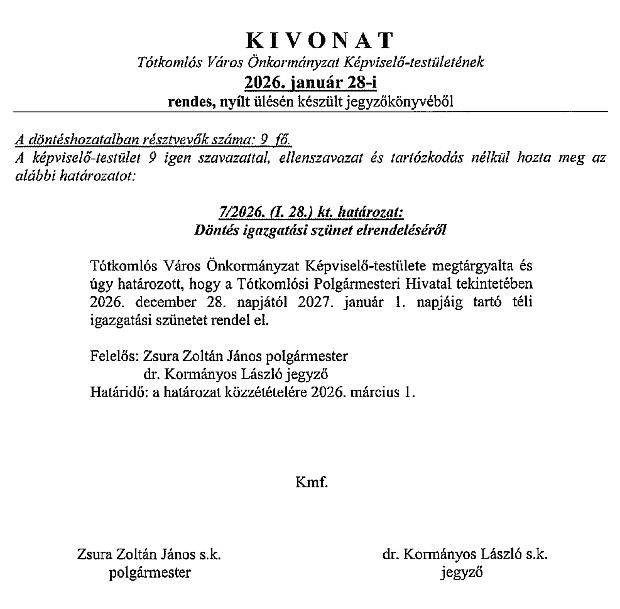 Igazgatási szünet a Tótkomlósi Polgármesteri Hivatalban