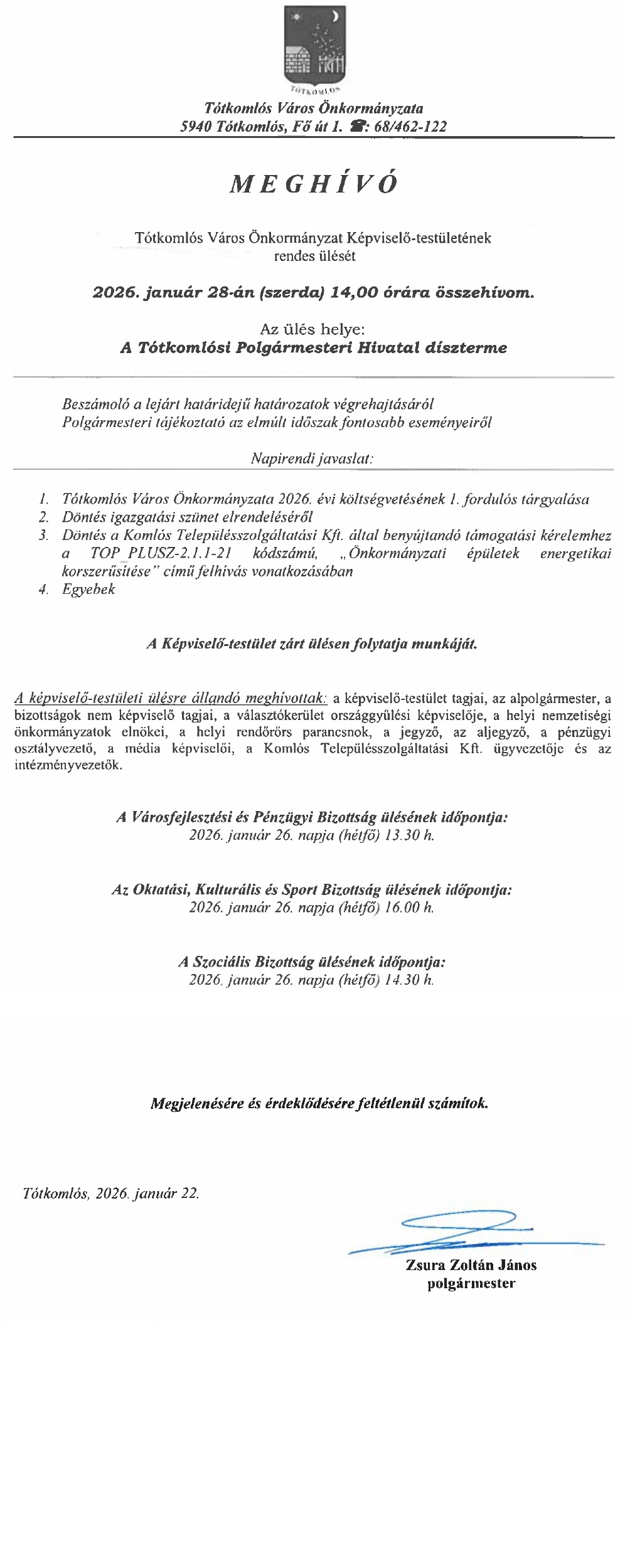 Meghívó Tótkomlós Város Önkormányzat Képviselő-testületének ülésére