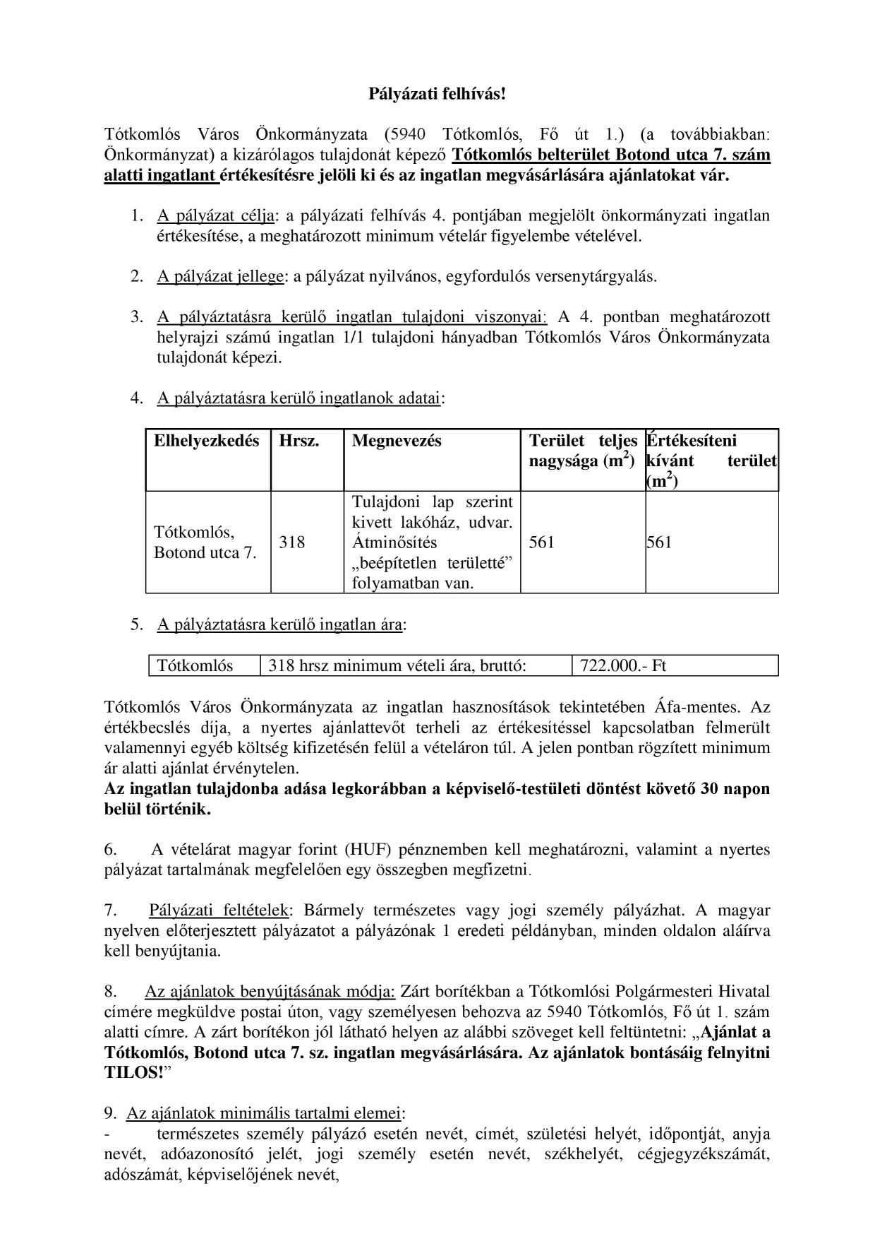 Tótkomlós Város Önkormányzata a tulajdonát képező Tótkomlós belterület Botond utca 7. szám alatti ingatlant értékesítésre jelöli ki és az ingatlan megvásárlására ajánlatokat vár